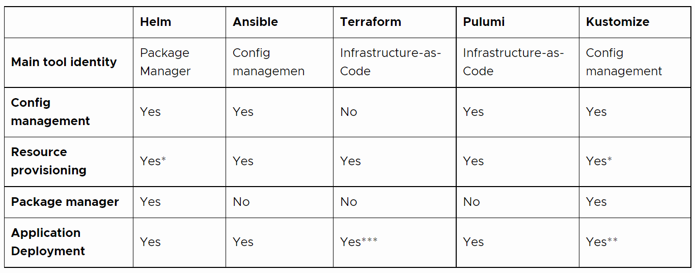 (* in combination with CrossPlane, Helm and Kustomize can provision cloud resources ** kubectl apply -k (docs) *** when you provision K8S resources with terraform provider is actually deploy)